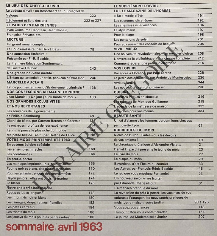 26,5 CM X 34 CM-356 PAGES-UNE COMEDIENNE RACONTE UNE COMEDIENNE: SOPHIA LOREN PAR FRANCOISE PREVOST, 3P-DANIEL FILIPACCHI PRESENTE LE JEUNE DU MOIS: JACQUY MOULIERE, 1P, PHOTO-L'HOMMAGE DE MARCELLE AUCLAIR A GERARD D'HOUVILLE, TIERS DE PAGE, PHOTO-LES SOUVENIRS DE LA GOUVERNANTE DE PHILIP D'EDIMBOURG-VOICI LA POLITESSE DU VETEMENT, PAR EDMONDE CHARLES-ROUX, 3P-LE BOUC EMISSAIRE, PAR HERVE BAZIN, ILLUSTRATIONS DE METTEIVERS, 16P-LES AVEUX DE JEAN MARAIS: UN JOUR, J'AI EU HONTE DE MOI., IL S'EST CONFIE AU MAGNETOPHONE DE LOUIS VALENTIN, 4P-ILS ONT CONNU LES DIFFICULTES DE TOUS LES JEUNES ILS ONT REUSSI PROFITEZ DE LEUR EXPERIENCE, 3P PAR MICHELE MANCEAUX, 12 PHOTOS, JEAN ROSTAND, PETER USTINOV, MARCEL ACHARD, EDITH PIAF, FRANCOISE ROSAY, ANDRE MAUROIS, GEORGES SIMENON, ARLETTY, MARIE-LAURE DE NOAILLES, INGRID BERGMAN, CLAUDE DAUPHIN, ELSA TRIOLET-C'EST KARIM LE PRINCE LE PLUS RICHE DU MONDE-MODE-MARIE-CLAIRE ET LUI LE MAGAZINE DE L'HOMME: SA MODE D'ETE, 9P, FIVOS RAZIS, JEAN-PIERRE CASSEL, MAURICE RONET, 18 PHOTOS-LA PREMIERE EDUCATION SENTIMENTALE DE GUSTAVE FLAUBERT, 3P-L'ENFANT QUI ATTENDAIT UN TRAIN, PAR JEAN D'ORMESSON-JEAN-PAUL GOUDE POUR PUBLICITE "DROPNYL HELANCA", 2 PAGES-DOS UN PEU TASSE