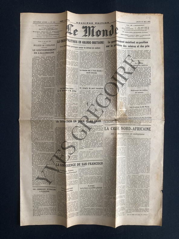 4 PAGES-35 CM X 50 CM-BULLETIN DE L'ETRANGER: LE GOUVERNEMENT DE L'ALLEMAGNE-LA CRISE POLITIQUE EN GRANDE-BRETAGNE-LA SITUATION EN SYRIE ET AU LIBAN-LA CRISE NORD-AFRICAINE II EUROPEENS ET INDIGENES-LA CONFERENCE DE SAN-FRANCISCO-LA QUESTION DE TRIESTE UN COMPROMIS SERAIT EN VUE-HAUTE COUR DE JUSTICE: LE PROCES DU MARECHAL PETAIN-M.WINSTON CHURCHILL A DONNE SA DEMISSION-L'ECHANGE DES BILLETS ET LES COMPTES EN BANQUE-PLIAGE D'ORIGINE