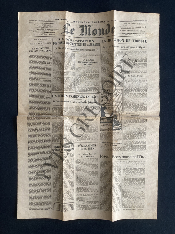4 PAGES-35 CM X 50 CM-LA DELIMITATION DES ZONES D'OCCUPATION EN ALLEMAGNE-LA QUESTION DE TRIESTE APRES LES DEMARCHES ANGLO-AMERICAINES A BELGRADE, CARTE, JOSEPH BROZ, MARECHAL TITO-DECLARATIONS DE M. EDEN-LA CONFERENCE DE SAN-FRANCISCO-LA GUERRE EN EXTREME-ORIENT-L'EPEE D'ACADEMICIEN DE M. EMILE HENRIOT-LE GENERAL DE LATTRE DE TASSIGNY RECOIT LA MEDAILLE MILITAIRE-ARRESTATION DE SCAPINI ET BOUSQUET-INCIDENTS AU THEATRE DE LA MICHODIERE, PIERRE FRESNAY