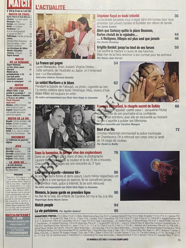 140 PAGES-23,5 CM X 30 CM-EN COUVERTURE "DALIDA SES DERNIERS SECRETS", EN BUSTE DENUDE SUR FOND BLEU-KARINE VIARD KAD MERAD PAIRE PRECIEUSE, 3P-QUAND JOE COLOMBO INVENTAIT LE FUTUR, 1P, 5 PHOTOS-MUNICH 1938 LES DESACCORDS DE GEORGES-MARC BENAMOU, 1P, PHOTO-DANIELA LUMBROSO ALLO MAMAN DOLTO, 1P, PHOTO-SEGOLENE ROYAL EN TOUTE INTIMITE, 8P-ALORS QUE SARKOZY QUITTE LA PLACE BEAUVAU, BORLOO CHOISIT DE LE REJOINDRE, 2P-A MATIGNON, DOMINIQUE DE VILLEPIN EST PLUS SEUL QUE JAMAIS, 4P-BIGITTE BARDOT JUSQU'AU BOUT E ES FORCES, 4P-LA FRANCE QUI GAGNE, LAUE MANAUDOU, 4P BRIN JOUBERT, 2P, VIRGINIE DEDIEU, 2P-LE SOLDAT MARLBORO A LE BLUES, 4P-FRANCOIS MITTERRAND LE CHAGRIN SECRET DE DALIDA, 6P-MORT D'UN FLIC, CHRISTIAN MARECHAL, 4P-LA JEUNE GARDE E PREMIERE LIGNE, BAL DE LA ROSE, MONACO, 4P-ANNONCE PATRICK BRUEL EN CONCERT, 1P-MOTS CROISES ENTAMES