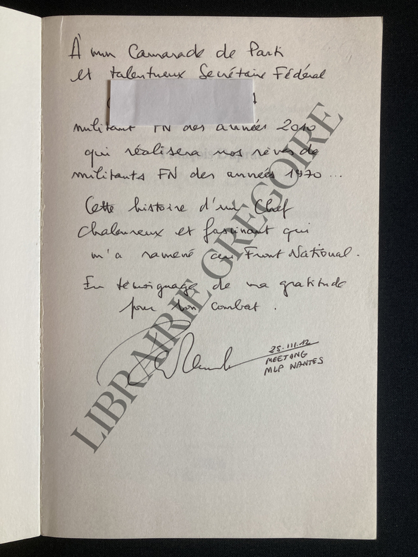 382 PAGESIN 8-LONG ENVOI DU CO-AUTEUR NICOLAS LEBOURG A UN SECRETAIRE FEDERAL DU FN-PHOTOGRAPHIE NOIR ET BLANC EN COUVERTURE-(5C)