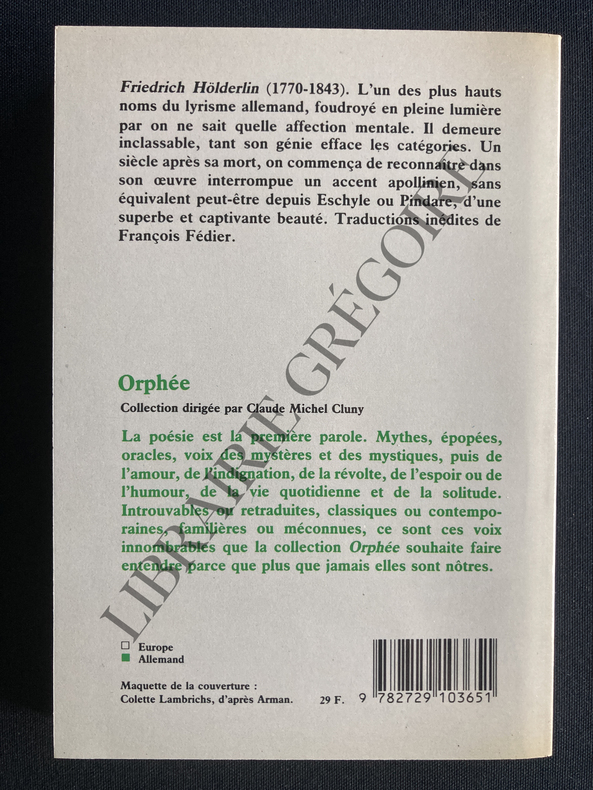 COLLECTION ORPHEE-TRADUIT DE L'ALLEMAND ET PRESENTES PAR FRANCOIS FEDIER-126 PAGES-11,5 CM X 16,6 CM-(4F)