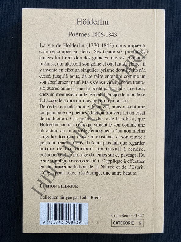 Trad. de l'allemand par Michel Deguy, André Du Bouchet, François Fédier, Philippe Jaccottet, Denise Naville, Gustave Roud, Robert Rovini et Jean Tardieu . Édition publiée sous la direction de Philippe Jaccottet, Gallimard, Bibliothèque de la Pléiade , 1977, 1266 pages, rel. peau, 105 x 170 mm., avec jaquette, rhodoïd un peu jauni et avec petit manque, sans boîtier.