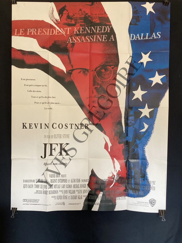 120 CM X 160 CM-KEVIN COSTNER ET SCENE DE L'ASSASSINAT DANS LA PARTIE ROUGE DE L'AFFICHE-LEE HARVEY OSWALD DANS LA PARTIE BLEUE