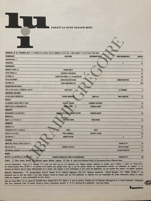 114 PAGES-21,5 CM X 27,5 CM-TETE A TETE AVEC LE GENERAL SALAN, 3 PHOTOS-LA GUERRE A 9 ANS 1/2, PAR PASCAL JARDIN, ILL CLEMENT DESPRES (L'AUTEUR ENTRE PETAIN ET LAVAL)-MARLENE, NOUVEL ANGE BLOND, CHARME, 8P-COUP D'ETAT A WASHINGTON, PAR SERGE LENTZ, ILL GERARD MARIE-ZOE AU ZOO, CHARME, 8P, PHOTO SUR 3P-DESSIN D'ASLAN PLEINE PAGE-DOUCEMENT LES BASQUES, PAR ANNICK GEILLE ET ANDRE HALIMI, ILL GERARD MARIE-METTEZ LES RAYURES DE VOTRE COTE!, MODE, TENNIS, CRICQUET, 4P-LE DES CARS PRODIGIEUX, ILL BOB ELIA-BOSC: ECRANMOTEUR ET CINEGAG, 3P-PROUST MA CHERE, PAR PAUL GIANNOLI, ILL GILBERT STONE-CATHERINE JOURDAN: ELLE EST NUE LA DIVINE ENFANT!, CHARME, 4P-MORT A L'ATTACHE, PAR GARSON KANIN, ILL GROSSMAN