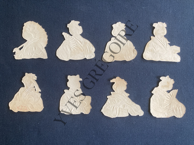 8 DECOUPIS-LA MEME PERSONNE AVEC TENUES ET ACCESSOIRES DIFFERENTS (4 AVEC EVENTAIL, 1 OMBRELLE, 1 BOUQUET, 1 BOITE, 1 MANDOLINE)-VERS 1900