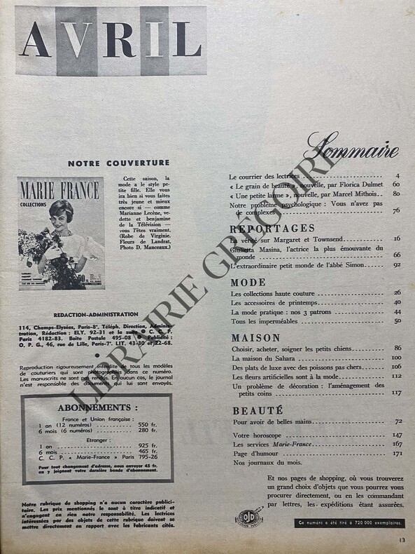 172 PAGES-23,5 CM X 31 CM-EN COUVERTURE MARIANNE LECENE, SPEAKERINE, PHOTO MANCEAUX-LE CAS SAGAN, DEMI PAGE, PHOTO-LA VERITE SUR MARGARET ET TOWNSEND, 7P-LE JOURNAL DE LA MODE SPECIAL COLLECTIONS, 20 PAGES-GIULIETTA MASINA, 7P PAR JACQUES MOUSSEAU-UNE PETITE LARME, NOUVELLE INEDITE PAR MARCEL MITHOIS, ILLUSTRATION DE JACQUES POIRIER-L'EXTRAORDINAIRE PETIT MONDE DE L'ABBE SIMON, 6P-ARTS MENAGERS 1958, LA MAISON DU SAHARA