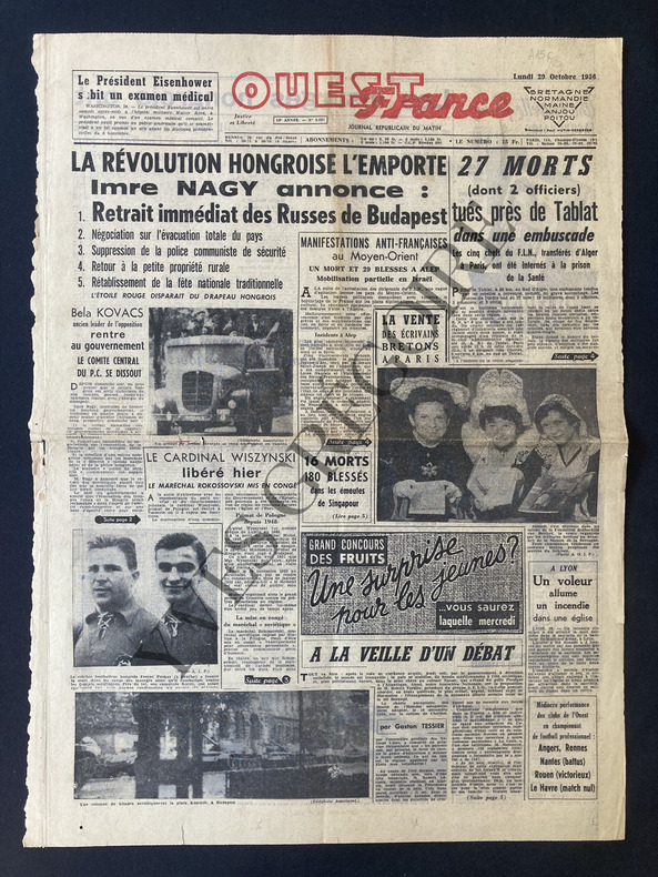 UNE ET PAGE 2 SEULES-P1: LA REVOLUTION HONGROISE L'EMPORTE IMRE NAGY ANNONCE: 1 RETRAIT IMMEDIAT DES RUSSES DE BUDAPEST, PHOTO JEUNES INSURGES EN CAMION, PHOTO COLONNE DE BLINDES SOVIETIQUES PLACE KOSSUTH, PHOTO FOOTBALLEUR FERENC PUSKAS ET KOCSIS-MANIFESTATIONS ANTI-FRANCAISES AU MOYEN-ORIENT UN MORT ET 29 BLESSES A ALEP MOBILISATION PARTIELLE EN ISRAEL-27 MORTS (DONT 2 OFFICIERS) TUES PRES DE TABLAT DANS UNE EMBUSCADE-P2: L'AFFAIRE DE HONGRIE, PHOTO VICTIMES-(RDA)