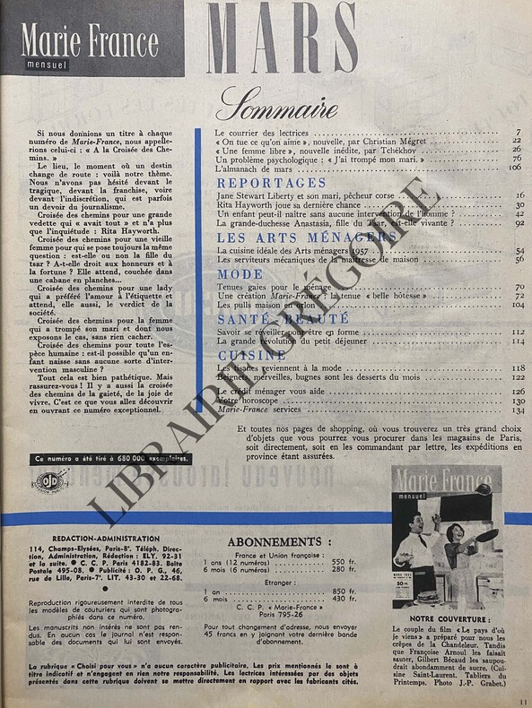 140 PAGES-23,5 CM X 31 CM-EN COUVERTURE GILBERT BECAUD ET FRANCOISE ARNOUL PREPARANT DES CREPES, FRANCOISE ARNOUL FAISANT SAUTER UNE CREPE, PHOTO GRABET-BON COURAGE, RITA!, 9P PAR FRANCOIS FORESTIER-DU "BEBE-EPROUVETTE" AU "BEBE SPONTANE": UNE HYPOTHESE SCIENTIFIQUE BOULEVERSANTE, PAR GEORGE SINCLAIR ET JEAN ROSTAND-ARTS MENAGERS 1957 AVEC SOPHIE DESMARETS, ANNIE GIRARDOT, ANNY FRATELLINI ET MARTHE MERCADIER, 19P-LA FILLE DU TSAR EST-ELLE VIVANTE?, PAR GUY BECHTEL, 10P, ANNA ANDERSON