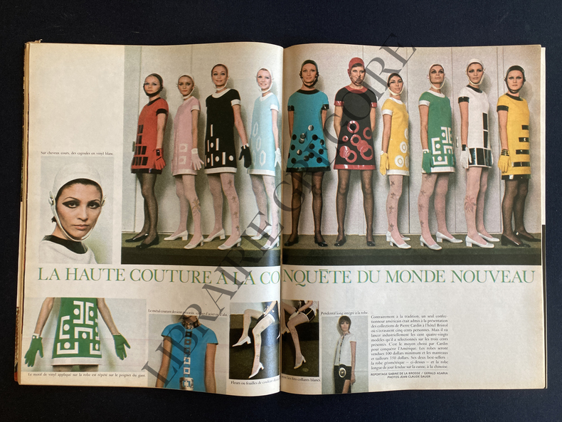 EN COUVERTURE "LE PARI DE PIERRE CARDIN", PIERRE CARDIN ASSIS A TERRE AVEC 2 MANNEQUINS-MONDRIAN PREND SA REVANCHE, 3P PAR PIERRE JOFFROY-NAPOLEON, PAR GASTON BONHEUR, 11P-LA HAUTE COUTURE A LA CONQUETE DU MONDE NOUVEAU, 4P, CARDIN-LES SHADOKS S'EMPARENT DE LA DEUXIEME CHAINE, 8 DESSINS SUR 1P