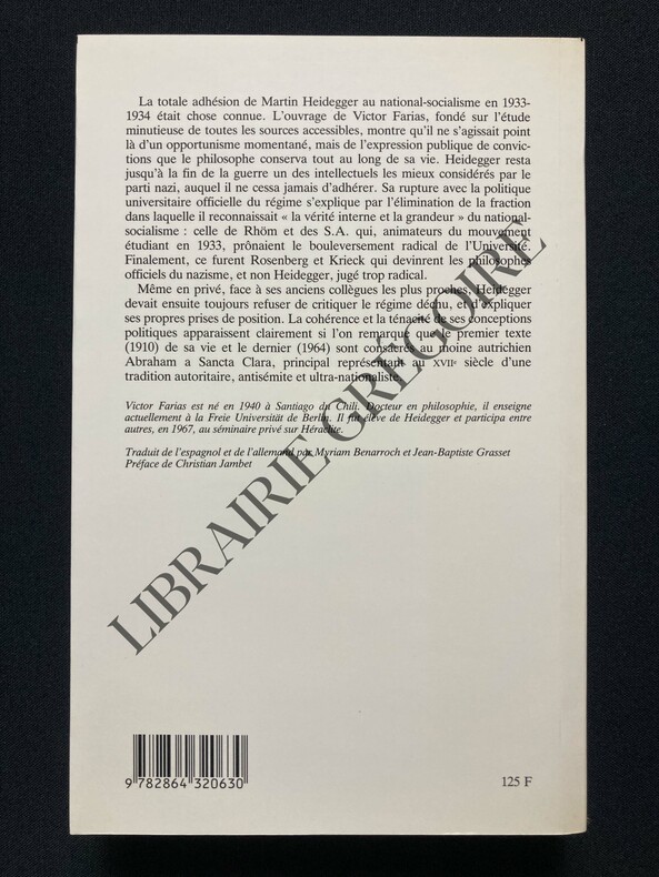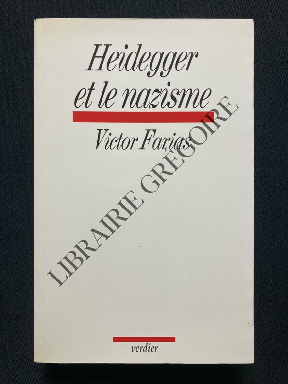Paris Verdier 1987. 381 pp. In-12. Broché. En bon état. 1 volume. Traduit de l' espagnol et de l' allemand par Myriam Benarroch et Jean-Baptiste Grasset.Préface de Christian Jambet."La publication de Heidegger et le nazisme révèle que le philosophe a participé volontairement au régime nazi. On savait certes depuis longtemps que le philosophe Martin Heidegger, mort en 1976, avait eu quelques faiblesses à l'égard du nazisme, qu'il avait notamment été recteur à Fribourg, en 1933-1934, et participé à ce titre à la mise au pas de l'Université allemande. Mais, d'après la version officielle, il ne s'agissait que d'un moment d'égarement de quelques mois, le philosophe ayant cessé par la suite toute collaboration avec le régime. Or, la publication, à l'automne 1987, du livre du Chilien Victor Farias, Heidegger et le nazisme (Verdier), remet brutalement en cause cette ligne de défense. Il montre que la compromission a été infiniment plus grave qu'on ne l'avait prétendu.Texte intégral. Édition revue et corrigée.