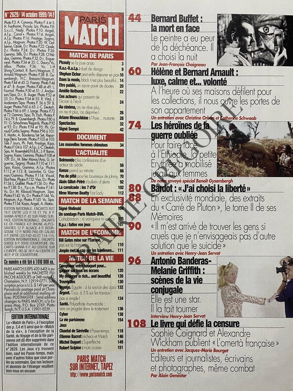 BRIGITTE BARDOT EN COUVERTURE "LES AVEUX D'UNE FEMME LIBRE"-PICOULY SE LA JOUE ARISTO, 3P-STEPHAN EICHER PEUT ENFIN DEJEUNER EN PAIX, 1P, 3 PHOTOS-BERNARD BUFFET LA MORT EN FACE, 12 PAGES-LES CONFESSIONS D'UN ACTEUR DU SIECLE, JEAN-PAUL BELMONDO, 4P-HELENE ET BERNARD ARNAULT LUXE, CALME ET.VOLONTE, 6P-KENZO UN JEUNE HOMME PREND SA RETRAITE, 4P-BARDOT "J'AI CHOISI LA LIBERTE", 12P