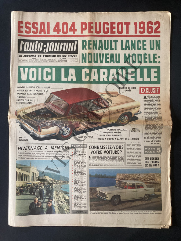 FORMAT 43 CM X 60 CM-EN UNE: VOICI LA CARAVELLE, ECORCHE-LA CARAVELLE PREND SON ENVOL A GENEVE, 1P, 3 PHOTOS-LA 404 PEUGEOT AU BANC D'ESSAI, 3P, 9 PHOTOS, ECORCHE, GRAPHIQUES, COUPES-LYON: CAPITALE EUROPEENNE DU JOUET ET DE L'ENFANT, 2 PHOTOS (DINKY TOYS, SOLIDO)-MENTON: RONRONS SOUS LES ORANGERS, 2P, 8 PHOTOS, CARTE-LES COMBINARDS DOIVENT DISPARAITRE POUR QUE LE PAYS PROFITE DU TRANSFERT DES HALLES DE PARIS, 2P, 7 PHOTOS, DESSIN, PLAN -