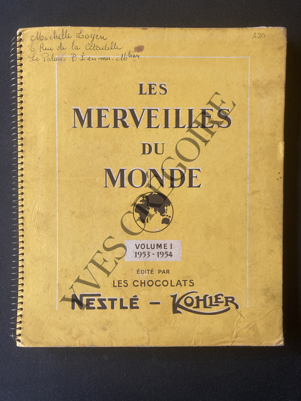 1953-1954, Les Chocolats Nestlé et Kohler, in-4 cartonné jaune, reliure spirale, volume 1, séries 1 à 18, incomplet, manque 54 vignettes | Etat : bon état, couverture un peu défraîchie, bas de la reliure spirale abîme (Ref.: G6233)
