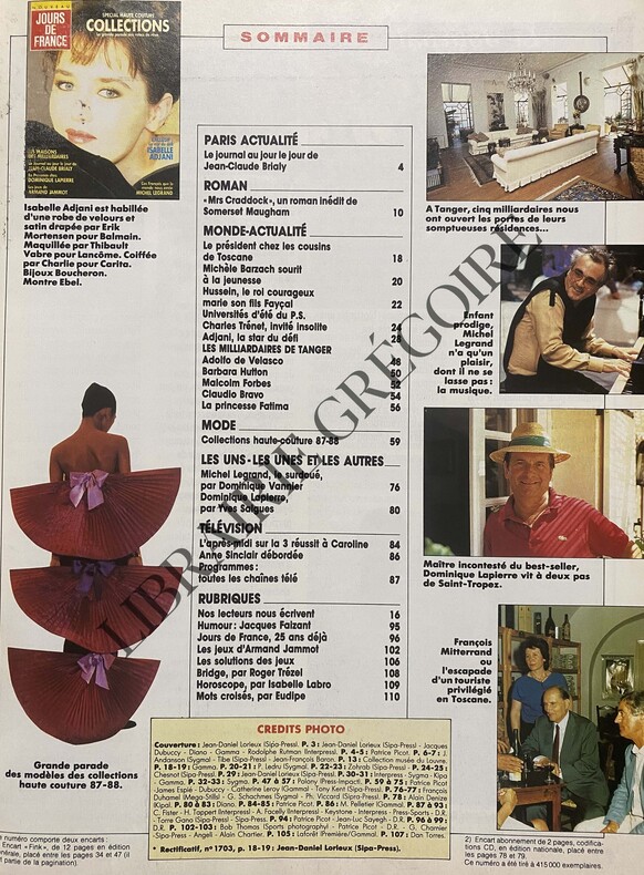 ISABELLE ADJANI EN COUVERTURE-ADJANI LA STAR DU DEFI, 6P-LES MILLIARDAIRES DE TANGER, 12P-COLLECTIONS HAUTE COUTURE V87-88, 18P-MICHEL LEGRAND LE SURDOUE, 3P-DOMINIQUE LAPIERRE, 4P-ANNE SINCLAIR DEBORDEE, 1P, 2 PHOTOS