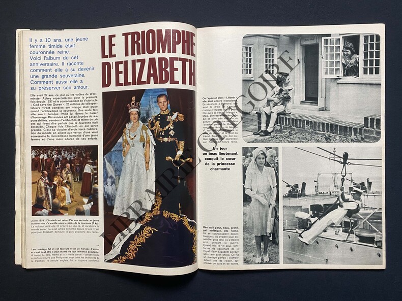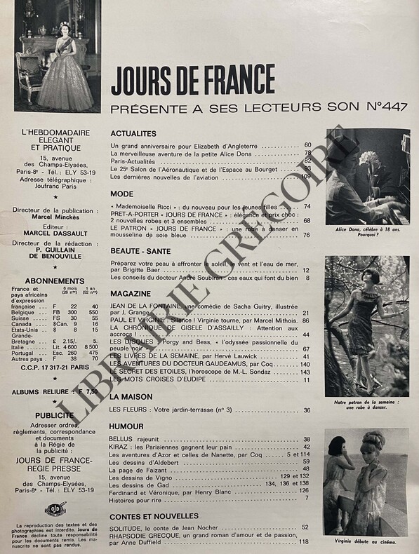 26,5 CM X 34 CM-EN COUVERTURE ELIZABETH D'ANGLETERRE-PUBLICITE PERRIER ET RENAULT DAUPHINE SUR 2 PAGES-LES CONTES DE JOURS DE FRANCE PAR JEAN NOCHER: SOLITUDE, FRANCOISE BRIONLE TRIOMPHE D'ELIZABETH, 6P-PRET A PORTER, 6P-MADEMOISELLE RICCI, 2P-UNE NOUVELLE ALICE AU PAYS DES MERVEILLES, ALICE DONNA, 4P PAR PIERRE BENICHOU, 7 PHOTOS-10 SUR 10 POUR C.C. DANS 8 1/2, 2P, 3 PHOTOS-SILENCE! VIRGINIE TOURNE, DANY SAVAL, 3P, 3 PHOTOS