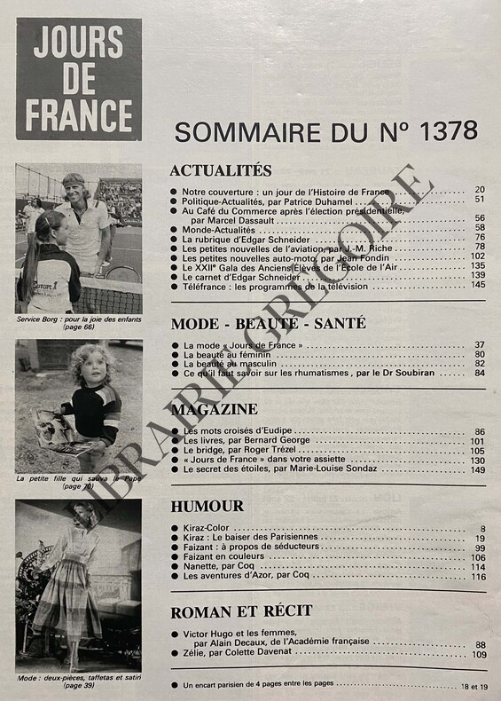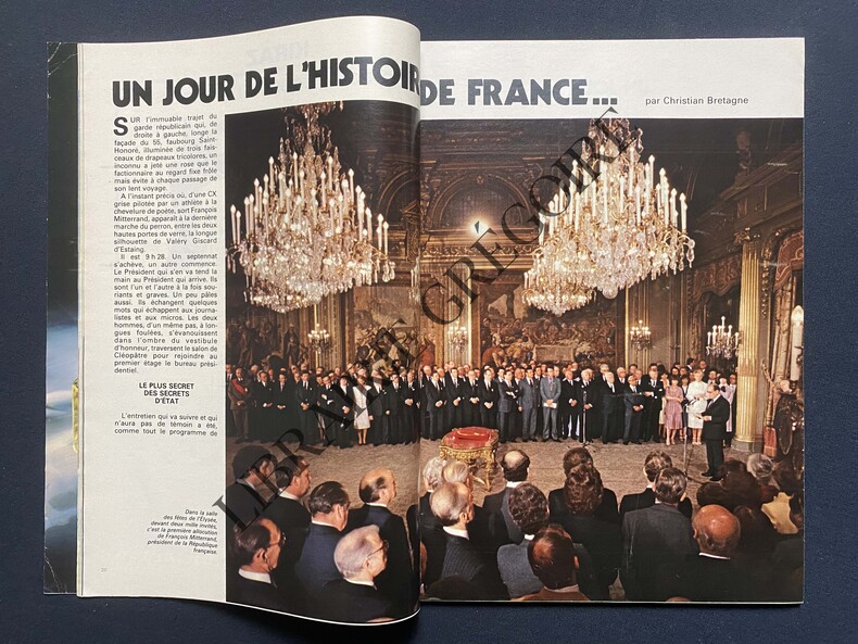 EN COUVERTURE "MITTERRAND PRESIDENT", DEBOUT DANS LA VOITURE PRESIDENTIELLE, SALUANT-KIRAZ COLOR-UN JOUR DE L'HISTOIRE DE FRANCE, MITTERRAND, 15 PAGES-LA MODE "JOURS DE FRANCE", 12P-CANNES: LES LAURIERS SONT COUPES, 4P-BARCELONE: LA VIOLENCE-BORG: LE REVE DES "POUSSINS" DU TENNIS, 3P-GUILLERMO VILAS POUR PUBLICITE PERRIER-CRITIQUE POUR "UNE ENFANCE SICILIENNE D'APRES FULCO DI VERDURA", PAR EDMONDE CHARLES ROUX, 1P PAR BERNARD GEORGE, PHOTO-MICHEL PICCOLI POUR CYCLOMOTEUR PEUGEOT, 2P, 2 PHOTOS NOIR ET BLANC-