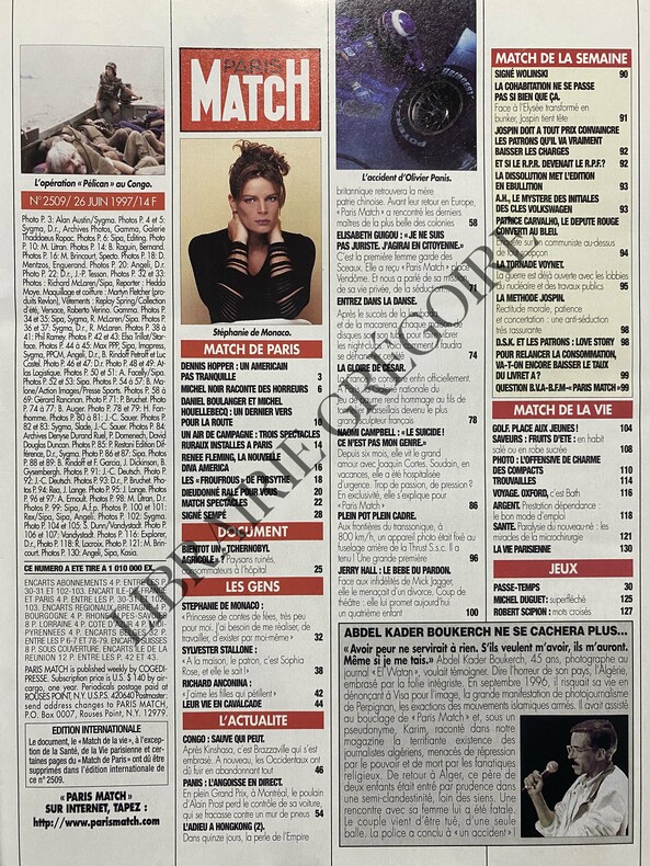 EN COUVERTURE "STEPHANIE "PAS D'HOMME DANS MA VIE!"-DENNIS HOPPER, 3P, 10 PHOTOS-UN DERNIER VERS POUR LA ROUTE, MICHEL HOUELLEBECQ, DANIEL BOULANGER, 1P, PHOTO-DIEUDONNE RALE POUR VOUS, 1P, 3 PHOTOS-STEPHANIE DE MONACO, 6P-SYLVESTER STALLONE, 4P-RICHARD ANCONINA, 2P, 4 PHOTOS-PANIS L'ANGOISSE EN DIRECT, 4P-L'ADIEU A HONGKONG, 13P-LA GLOIRE DE CESAR, 8P-JERRY HALL LE BEBE DU PARDON, 3P-GERARD LANVIN POUR PUBLICITE "CONNEXION"