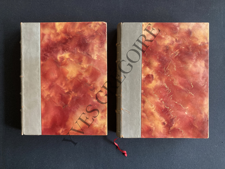 5 LIVRES EN 2 VOLUMES IN 4 -170 ET 238 PAGES-PUBLICATION EN 1940 ET 1941-32 ILLUSTRATIONS EN COULEURS ET 77 DESSINS EN NOIR DE BRUNELLESCHI-EDITION SUR VELIN DES PAPETERIES DE NAVARRE-EXEMPLAIRE N°850 SUR UN TIRAGE DE 3000-RELIURE CUIR GRIS-5 NERFS-TITRES DORES-PLATS MARBRES-LEGERES ET RARES ROUSSEURS-4 NERFS LEGEREMENT FROTTES