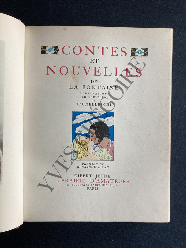 Inutile de revenir sur le texte des Contes et Nouvelles en vers de La Fontaine, paru pour la première fois entre 1665 et 1671 (sans illustrations) et pour la première fois illustré en 1685. Aquarelle originale monogrammée Aquarelle originale signée (définitive) ayant servi au clichage De nombreux artistes ont illustré ces Contes et Nouvelles en vers, toujours lestes ou grivois, avec ou sans l'inspiration délibérément érotique que chacun a pu y mettre depuis la première édition illustrée de 1685. Aquarelle originale monogrammée Les Contes et Nouvelles en vers de La Fontaine, inspirés de plusieurs œuvres françaises et italiennes des XVe et XVIe siècles, dont le Décaméron de Giovanni Boccace, Orlando furioso de Ludovico Ariosto, le recueil anonyme des Cent Nouvelles Nouvelles et l'œuvre de Bonaventure Des Périers, sont mille fois plus réjouissant à lire que les célèbres Fables dont on a rebattu les oreilles de tout élève en devenir d'être un homme. Les Contes et Nouvelles avaient sans l'ombre d'un doute mille fois plus de raisons pour forger un homme près à affronter son destin croisant celui des dames. Chacun cherche son chat ... Aquarelle originale monogrammée Cette édition est à tort négligée des bibliophiles du fait d'un tirage trop important. Il faut rechercher comme ici les exemplaires de luxe. Aquarelle originale monogrammée Les aquarelles originales de Charles Martin sont très prisées des amateurs. Il fut un des grands illustrateurs de la période Art Déco. Charles Martin est né à Montpellier en 1884 et mort à Paris en 1934 à l'âge de 50 ans seulement. Sa production est très importante. Il a contribué à l'illustration de nombreuses revues d'art et de mode depuis 1912 (Gazette du Bon Ton, Femina, etc). La guerre où il sert comme simple soldat d'infanterie stoppe nette sa carrière mais il continue malgré tout à dessiner et à envoyer ses travaux à la presse, tant qu'il peut. Lors d’une permission, il montre son travail à Lucien Vogel, le créateur de la révolutionnaire Gazette du Bon Ton. Enthousiaste, l’éditeur lui propose d’en tirer un album. Sous les Pots de Fleurs (le terme désigne le casque Adrian qui équipe l’armée française) paraît le 1er décembre 1917. Comme un Laboureur ou un Chas Laborde, Martin refuse de se soumettre à la « culture de guerre ». On ne trouve chez lui aucune des outrances et conventions du dessin naturaliste et de son pseudo réalisme. Il revient de la guerre. Le style de Charles Martin, au trait délicat, excelle dans les techniques de l'eau-forte et du pochoir rehaussé d'un trait typographique. Influencé par le cubisme, son style devient épuré et se caractérise par un trait précis, efficace et joyeux. Il s'oriente rapidement vers le luxe et l'art décoratif. Il exerce son talent dans les domaines les plus variés : mode, flacons de parfumerie, meubles, papiers peints, affiches, etc. Charles Martin a illustré une vingtaine de livres dont les Contes et Nouvelles de La Fontaine que nous présentons ici. Nous soupçonnons par ailleurs Charles Martin d'avoir illustré un clandestin totalement érotique en 1926 dont le trait est vraiment typique de l'artiste (mais ...). Aquarelle originale monogrammée Exceptionnel exemplaire contenant 8 aquarelles originales abouties et 1 esquisse pour une composition libre, une suite libre de 15 eaux-fortes en noir et une suite complète des 64 compositions hors-texte (soit 143 estampes au total). Très bon exemplaire tel que paru.
