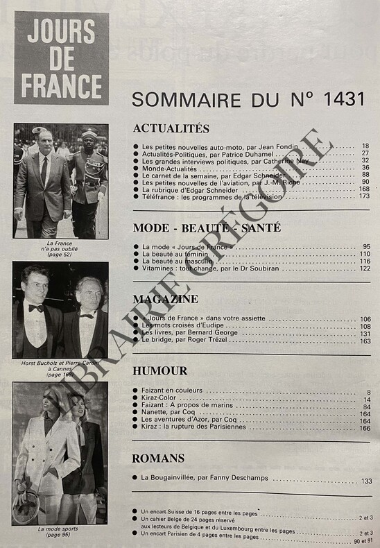 EN COUVERTURE "ROMY: SA DERNIERE PHOTO", GROS PLAN COULEURS-KIRAZ COLOR, PAGE COULEURS-MAURICE FAURE, 4P PAR CATHERINE NAY-ROMY N'EST PLUS, 6P-ROLAND GARROS: DEUX NOUVEAUX VISAGES, 4P, CATHERINE TANVIER, LOIC COURTEAU-DANS LA VOITURE D'ANNA: LA BOMBE, ANNA COSMEDIS, 6P-HOSSEIN: LE MARIAGE DE COSETTE, 4P-AIRE SUR L'ADOUR: L'ENFER DES INNOCENTS, 6P-CANNES-LES "22" SUR LEUR 31, 2P, 5 PHOTOS, COUPE DU MONDE DE FOOTBALL-LA MODE "JOURS DE FRANCE" SPORTS, 10P, TENNIS, GOLF