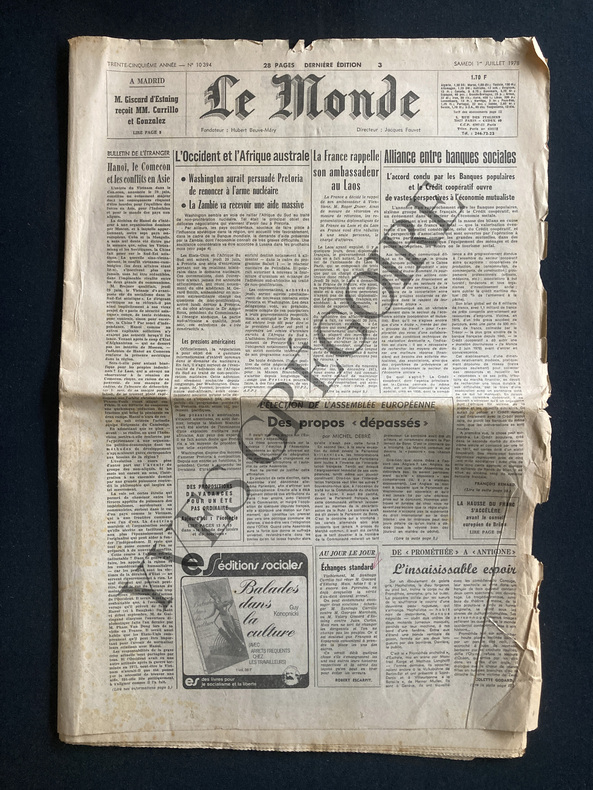 28 PAGES-35 CM X 50 CM-L'ELECTION DE L'ASSEMBLEE EUROPEENNE DES PROPOS "DEPASSES", PAR MICHEL DEBRE-MORT DE LA COMEDIENNE JOSETTE DAY-CINEMA PAR JACQUES SICLIER: ENTRETIEN AVEC CARLOS SAURA LA TORTURE, LA CREATION ET L'AMOUR-LES DIFFICULTES DU GROUPE BOUSSAC UNE AFFAIRE D'ETAT-COMPLET
