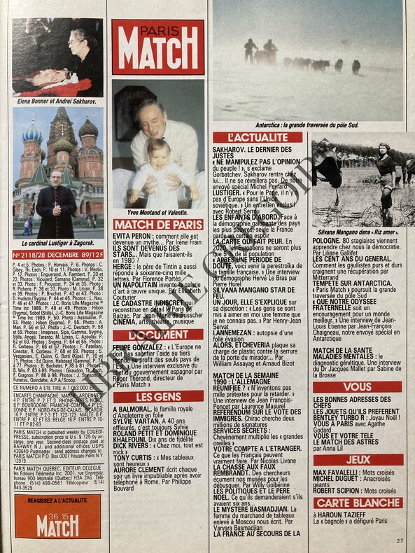 EN COUVERTURE YVES MONTAND ET SON FILS VALENTIN-EVITA PERON COMMENT ELLE EST DEVENUE UN MYTHE, 3P-LE PERE DE TINTIN A AUSSI REPONDU A SOIXANTE-CINQ MILLE LETTRES 1P, PHOTO-FELIPE GONZALEZ, INTERVIEW-SYLVIE VARTAN A 40 ANS EFFLEURES C'EST TOUJOURS SYLVIE-DICK RIVERS "CHEZ MOI TOUT EST ROCK", 2P-TONY CURTIS, 2P, 2 PHOTOS-SILVANA MANGANO, 10P-CARTE BLANCHE A: HAROUN TAZIEFF LA "BAGNOLE" A DEFIGURE PARIS, 1P, PHOTO-(BA1)