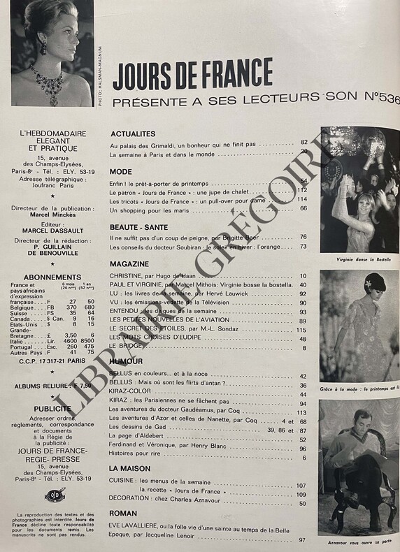 116 PAGES-26,5 CM X 34 CM-EN COUVERTURE GRACE DE MONACO, EN BUSTE COULEURS-JANE FONDA POUR PUBLICITE LUX-AU PALAIS DES GRIMALDI UN BONHEUR QUI NE FINIT PAS, 4P PAR YVES SALGUES-NOUVELLE VAGUE ANGLAISE LES BEATLES PHOTO-EVE LAVALLIERE, 4P