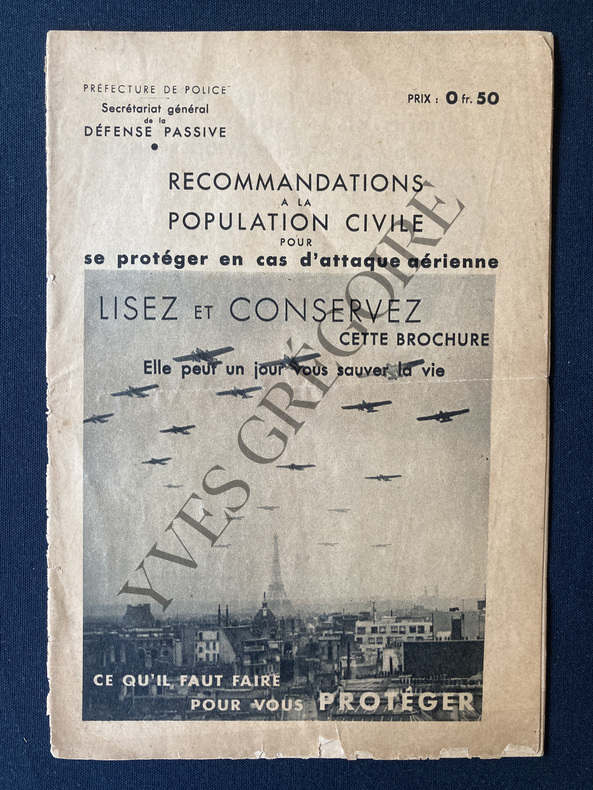 NON DATE-VERS 1940-16 PAGES-IN 8-PREFECTURE DE POLICE SECRETARIAT GENERAL DE LA DEFENSE PASSIVE-LISEZ ET CONSERVEZ CETTE BROCHURE ELLE PEUT UN JOUR VOUS SAUVER LA VIE-CE QU'IL FAUT FAIRE POUR VOUS PROTEGER-TOUS LES MOYENS DE DEFENSE SERONT MIE EN OEUVRE POUR ARRETER LES AVIONS ENNEMIS-SI VOUS DEVEZ RESTER-L'ALERTE EST DONNEE-L'ATTAQUE EST TERMINEE-SI VOUS ETES GAZE: BRULE: BLESSE:-19 PHOTOGRAPHIES NOIR ET BLANC1 DE COUVERTURE DETACHEE ET RECOLLEE (CPP2)
