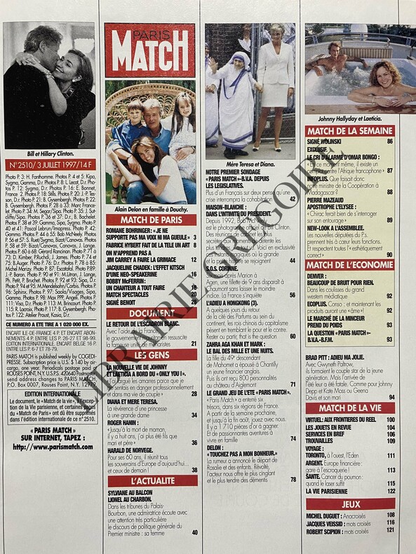 EN COUVERTURE "DELON LE CRI DE COLERE "NE TOUCHEZ PAS AUX MIENS!", ALAIN DELON ROSALIE ALAIN FABIEN ET ANOUCHKA-ROMANE BOHRINGER "JE NE SUPPORTE PAS MA VOIX NI MA GUEULE", 3P-LA NOUVELLE VIE DE JOHNNY ET LAETITIA A BORD DU "ONVY YOU I", 6P-SOS CORINNE, VINZEND, CHAUMONT, 4P-DELON "TOUCHEZ PAS A MON BONHEUR", 8P-BRAD PITT ADIEU MA JOLIE