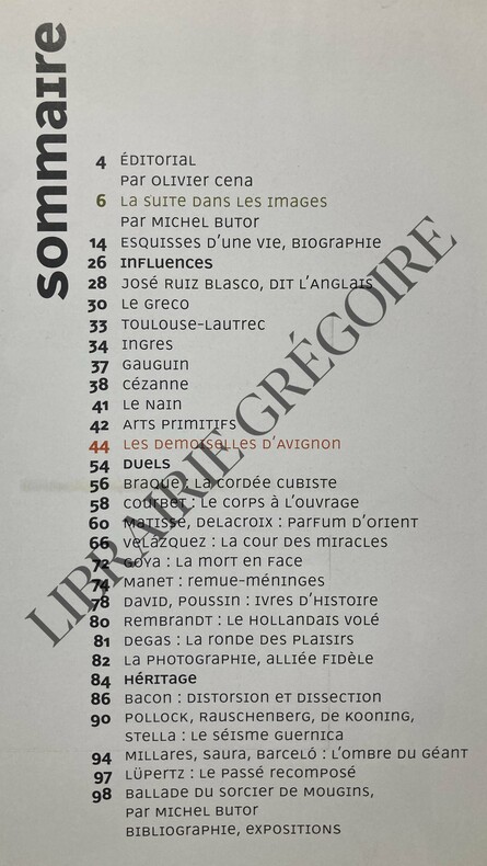 100 PAGES-23 CM X 30 CM-EN COUVERTURE GROS PLAN NOIR ET BLANC (VALLAURIS 1954)-FOU DE PEINTURE, PAR OLIVIER CENA-LA SUITE DANS LES IMAGES, PAR MICHEL BUTOR-ESQUISSES D'UNE VIE-INFLUENCES L'ANGLAIS, LE GRECO, TOULOUSE LAUTREC, INGRES, GAUGUIN, CEZANNE, LE NAINARTS PRIMITIFS-LES DEMOISELLES D'AVIGNON UN SACRE BORDEL-DUELS BRAQUE LA CORDEE CUBISTE, COURBET LE CORPS A L'OUVRAGE, MATISSE DELACROIX PARFUM D'ORIENT, VELASQUEZ LA COUR DES MIRACLES, GOYA LA MORT EN FACE, MANET REMUE MENINGES, DAVID POUSSIN IVRES D'HISTOIRE, REMBRANDT LE HOLLANDAIS VOLE, DEGAS LA RONDE DES PLAISIRS, LA PHOTOGRAPHIE ALLIEE FIDELE-HERITAGE, BACON DISTORSION ET DISSECTION, LE SEISME GUERNICA POLLOCK, DE KOONING, RAUSCHENBERG, STELLA, L'OMBRE DU GEANT, SAURA, MILLARES, BARCELO, LE OASSE RECOMPOSE, LUPERTZ