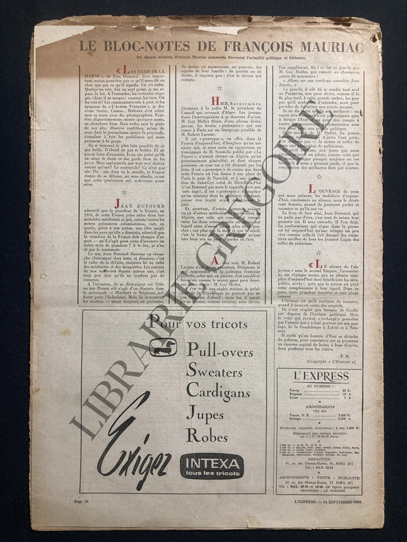 20 PAGES-30 CM X 43 CM-EN COUVERTURE "L'HOMME DE LA SEMAINE:HABIB BOURGUIBA", GROS PLAN NOIR ET BLANC, SUITE 2 PAGES CENTRALES PAR THOMAS LENOIR, 2 PHOTOS-THEATRE: "LE SQUARE", UNE PIECE INVOLONTAIRE PAR MARGUERITE DURAS-LE BLOC NOTES DE FRANCOIS MAURIAC