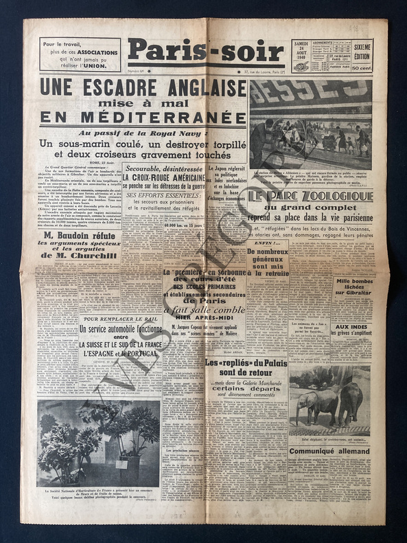 4 PAGES-43 CM X 60 CM-UN UNE: "LA STATION DE METRO "ABBESSES" RESERVE UNE SURPRISE ARTISTIQUE LE PEINTRE MAISSEN GARDIEN DE LA STATION EMPLOIE SES HEURES DE GARDE A LA DECORER", PHOTOGRAPHIE 14,5 CM X 0,5 CM ("LE PEINTRE AUPRES DE SUPERBES PANNEAUX PHOTOGRAPHIES CE MATIN")-UNE ESCADRE ANGLAISE MISE A MAL EN MEDITERRANEE