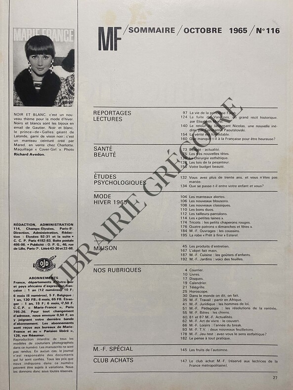 296 PAGES-24 CM X 31 CM-EN COUVERTURE PHOTOGRAPHIE COULEURS DE RICHARD AVEDON, MODE-DECES DE DANIEL ROPS, PHOTO-URSULA ANDRESS POUR PUBLICITE LUX-C'EST L'ANNEE DU BREAK-LA VEDETTE DE LA RENTREE S'APPELLE CHRISTINE DELAROCHE, 2 PAGES, 4 PHOTOS-MODE RENTREE, LES MANTEAUX ALERTES, LES NOUVEAUX BLOUSONS, LES NOUVEAUX CLASSIQUES, LES BONS DUOS, JEUNES HARDIS LE TAILLEUR PANTALON, "LES PETITES LAINES", LES TAILLEURS PALETOTS, SOIR SANS SOUCI-LA TRAGEDIE DE VARENNES LA CHEVAUCHEE HISTORIQUE, 8P