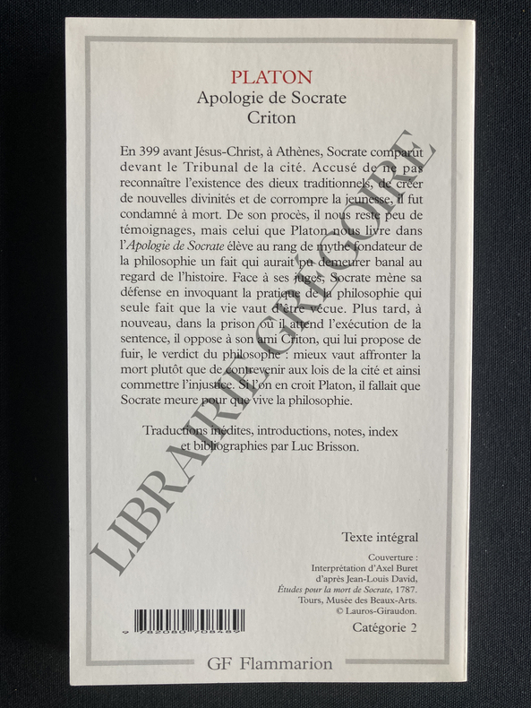 COLLECTION GF-264 PAGES-FORMAT POCHE-INTRODUCTIONS ET TRADUCTIONS INEDITES DE LUC BRISSON-EDITION CORRIGEE ET AUGMENTEE D'UN SUPPLEMENT BIBLIOGRAPHIQUE (1997-2004)-COUVERTURE ILLUSTREE (ETUDES POUR LA MORT DE SOCRATE)-(12E)