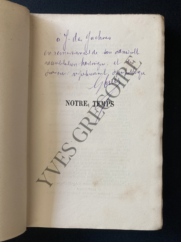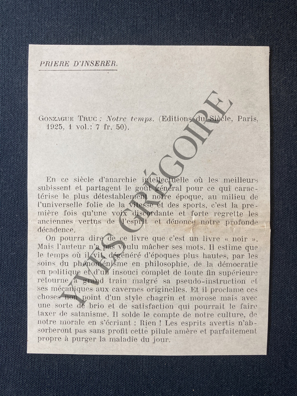 EXEMPLAIRE SERVICE DE PRESSE-PRIERE D'INSERER-ENVOI DE L'AUTEUR AU ROMANCIER ET CRITIQUE LITTERAIRE JACQUES DES GACHONS "A J. DES GACHONS EN REMERCIEMENT DE SON ADMIRABLE RECONSTITUTION HISTORIQUE ET EN SOUVENIR RESPECTUEUSEMENT SYMPATHIQUE" SIGNATURE-BROCHE-190 PAGES-12 CM X 19 CM-2 TACHES EN PREMIER PLAT REPARABLES-(JDG21)