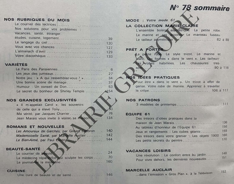 258 PAGES-26 CM X 35 CM-EN COUVERTURE BRIGITTE BARDOT, TRES GROS PLAN, PHOTO WALTER CARONE-ILLUSTRATION DE GRUAU POUR GAINE CHRISTIAN DIOR-L'USINE BARDOT, DESSIN GABRIEL PASQUALINI HISTOIRES DE FARCEURS, PHOTO PHILIPPE DE BROCA-ANTONELLA LUALDI POUR PUBLICITE LUX, COULEURS-IL M'APPELAIT CAROL, PAR CAROL COOMBE, 13 PAGES-MA VERITE, PAR JACQUES CHARRIER, TEXTE RECUEILLI PAR JEANNE DODEMAN, 6 PAGES, PHOTOS-VOTRE MODE 61, 28 PAGES-ILLUSTRATION DE GRUAU POUR TISSU BOUSSAC, PLEINE PAGE COULEURS-JEAN MARAIS VOUS INVITE: ENTREZ DANS MA MAISON, 7 PAGES-LES AMOUREUX DE GARCHES, PAR GILBERT CESBRON-JE SUIS HEUREUSE PARCE QUE J'AI FAILLI MOURIR", PAR SHIRLEY TEMPLE, 4 PAGES-9500 MAGASINS "PAS COMME LES AUTRES", COOP, 2 PAGES, 5 PHOTOS