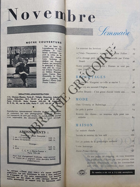 140 PAGES-23,5 CM X 30,5 CM-EN COUVERTURE: PASCALE AUDRET, PHOTO JEAN PIERRE GRABET-FRANCOISE SAGAN SE MARIE MAIS NE VA PAS TRES BIEN, DEMI PAGE, PHOTO-MAINTENANT LA "VEUVE NOIRE" ROMPT SON SILENCE, MARIE BESNARD, DEMI PAGE, PHOTO-BALENCIAGA EST UN FANTOME ET GIVENCHY UN ENFANT TERRIBLE, DEMI PAGE-LE MARIAGE DE MARGARET, 6 PAGES-UNE JEUNE FILLE DE 17 ANS NOUS A ECRIT CETTE LETTRE: "MAMAN NE VEUT PAS QUE J'AIME", 5 PAGES-L'AIGLON, 12 PAGES-CHEZ GIVENCHY ET BALENCIAGA LA VRAIE MODE DE DEMAIN?, 2P, 4 PHOTOS-CINQ COMEDIENNES VOUS PRESENTENT LE PRET A PORTER, ALAIN DELON, GIL VIDAL,.-LA HAUTE COUTURE CREE SON PRET A PORTER-MARLON BRANDO: C'EST GRAVE D'AVOIR TRENTE ANS , 6 PAGES PAR PHILIPPE LABRO