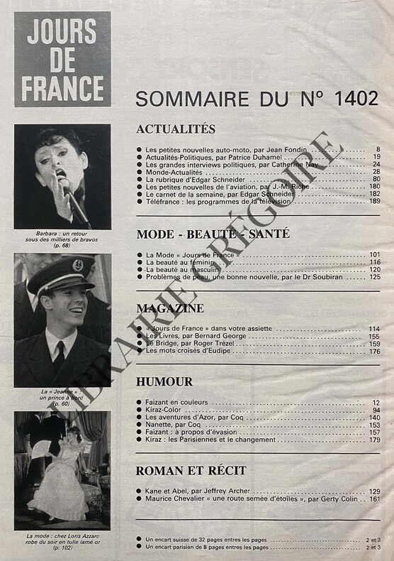 196 PAGES-24 CM X 33 CM-JOHNNY HALLYDAY POUR PUBLICITE CONTINENTAL EDISON-LES PAYS DE FRANCE ET D'AFRIQUE, PHOTO DE FAMILLE-CATHERINE NAY: PIERRE BEREGOVOY, 4 PAGES, 3 PHOTOS-DIANA: "CE SERA UN GARCON", 12 PAGES-UN SOUS MARIN VENU D'AILLEURS, WHISKEY 137, 6 PAGES-PATRICK SABATIER A 30 ANS LA REUSSITE, 6 PAGES, 4 PHOTOS (PHOTO SUR 2 PAGES, COURREGES, MICHELE MORGAN, BLUE BELL GIRLS)-A FORMOSE UN CHEVAL D'OR POUR ALAIN, 2P, PHOTO-BARBARA RETROUVEE, 4 PAGES, 5 PHOTOS-UN PRINCE A BORD DE LA "JEANNE", ALBERT DE MONACO, 2P, PHOTO-MIOU MIOU: IL M'ARRIVE DE ME REPOSER, 4P, 4 PHOTOS-DESSIN DE KIRAZ PLEINE PAGE COULEURS, COUPLE SUR DIVAN-LA MODE "JOURS DE FRANCE", 12 PAGES, BALENCIAGA, SAINT LAURENT-MAURICE CHEVALIER "UNE ROUTE SEMEE D'ETOILES", PAR GERTY COLIN-FRANCIS LATREILLE, GALERIE JOEL SALAUN, PHOTO