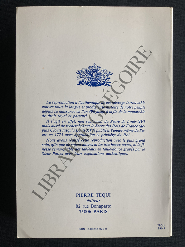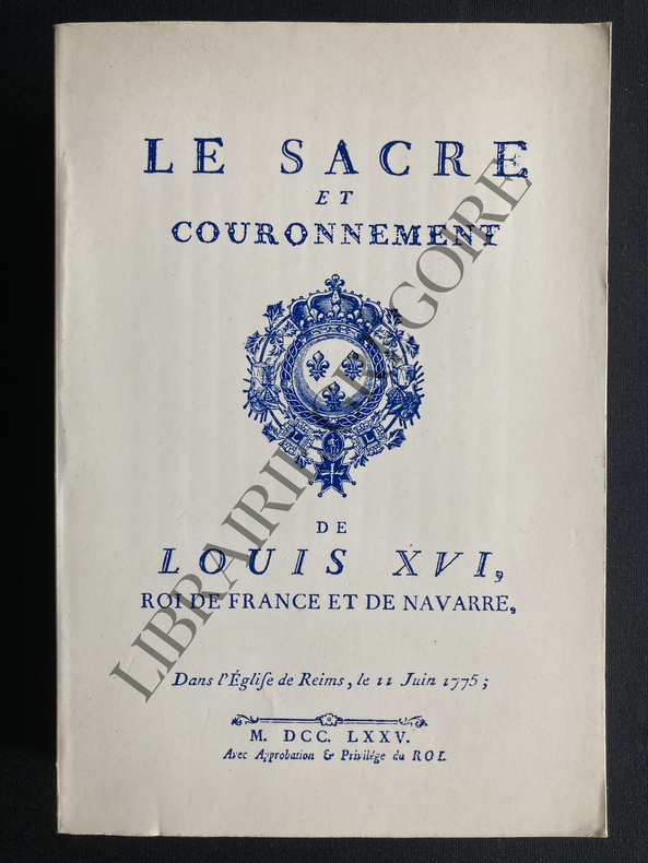 Paris, Tequi, 1989, Broché, Le Sacre et couronnement de Louis XVI, roi de France et de Navarre, dans l'église de Reims, le 11 juin 1775. Précédé de Recherches sur le sacre des Rois de France depuis Clovis jusqu'à Louis XVI; Et suivi d'un Journal Historique de ce qui s'est passé à cette auguste Cérémonie.Enrichi d'un très-grand nombre de figures en taille-douce gravées par Sieur Pattas. Reprint. Très bon état. Nombreuses reproductions en noir.