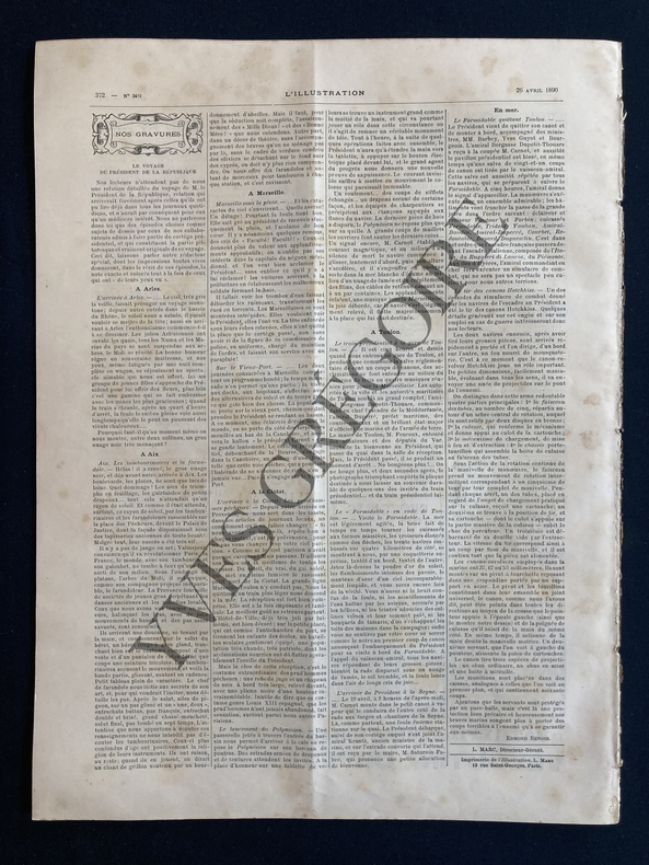 16 PAGES-IN 3-EN COUVERTURE: LE VOYAGE DU PRESIDENT DU PRESIDENT DE LA REPUBLIQUE M CARNOT SALUE PAR LES PRUD'HOMMES PECHEURS DE LA CIOTAT-SUITE 10 GRAVURES SUR 6 PAGES (LES ARLESIENNES OFFRANT DES FLEURS A M CARNOT, MARSEILLE SOUS LA PLUIE, AIX LA FARANDOLE DEVANT LE PALAIS DE JUSTICE, MARSEILLE ARRIVEE DU PRESIDENT SUR LE VIEUX PORT, PLEINE PAGE, LA CIOTAT LANCEMENT DU "POLYNESIEN", LE TRAIN PRESIDENTIEL EN GARE DE TOULON, LE "FORMIDABLE" EN RADE DE TOULON, L'ARRIVEE DE M CARNOT A LA SEYNE, TOULON M CARNOT SE RENDANT A BORD DU "FORMIDABLE" PRET A APPAREILLER ESCORTE DE L'ESCADRE POUR LA CORSE, PLEINE PAGE, SIMULACRE DE COMBAT NAVAL LE TIR DES CANONS HOTCHKISS, PLEINE PAGE), LEGENDES SUR 1 PAGE-LE CYCLONE DE LOUISVILLE, 1 PAGE, 3 GRAVURES (ASPECT D'UNE RUE DE LA VILLE APRES LE DESASTRE, LES RUINES DE LA GARE DE L'UNION DEPOT, L'EFFONDREMENT DE LA GRANDE HALLE DE LA GARE DE CHEMIN DE FER)-PETIT TRAITE DU MONOCLE, TEXTE DE GROSCLAUDE, ILLUSTRATIONS DE CARAN D'ACHE, 2 PAGES, 16 DESSINS-PLIURE CENTRALE D'ENVOI