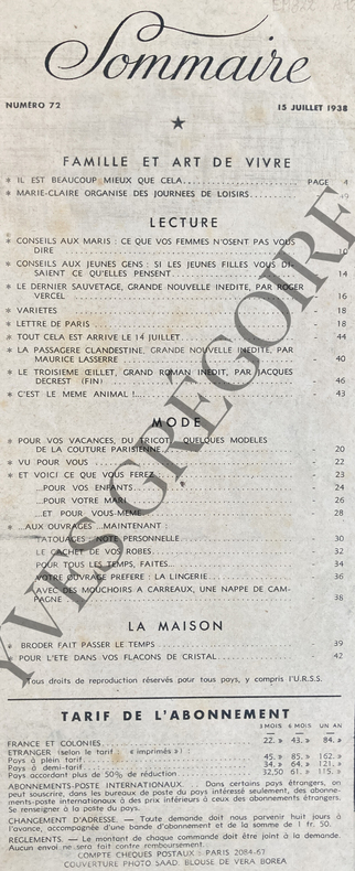 60 PAGES-GRAND IN 4-CONSEILS AUX MARIS CE QUE VOS FEMMES N'OSENT PAS VOUS DIRE, 4 PAGES PAR MARCELLE AUCLAIR, 12 PHOTOS-ENSUITE CONSEILS AUX JEUNES GENS SI LES JEUNES FILLES VOUS DISAIENT CE QU'ELLES PENSENT, 2P-LE DERNIER SAUVETAGE, NOUVELLE INEDITE PAR ROGER VERCEL, 3 PAGES-POUR VOS VACANCES: DU TRICOT, 2P-POUR VOS ENFANTS, MODE ENFANTS-POUR VOTRE MARI, MODE, 2P-ET POUR VOUS MEME, 2P, MODE-ET MAINTENANT AUX OUVRAGES TATOUES NOTE PERSONNELLE, 2P-LE CACHET DE VOS ROBES, MONOGRAMMES, 2P-LA LINGERIE-LA PASSAGERE CLANDESTINE, NOUVELLE INEDITE PAR MAURICE LASSERRE, 3 PAGES-TOUT CELA EST ARRIVE LE 14 JUILLET, 2P, 9 PHOTOS (TOUR DE FRANCE, GUILLAUME II, GENERAL BOULANGER,.)-LE TROISIEME OEILLET, ROMAN INEDIT PAR JACQUES DECREST, 2 PAGES-LEGERES ROUSSEURS EN COUVERTURE-(EM822)