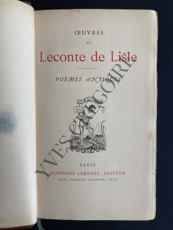 3 volumes in 12 demi toile bleue,pièce de titre cuir noir. poèmes barbares faux- titre,titre 368 pages.Poèmes Antiques Portrait de l’auteur en frontispice titre, 317 pages.Poèmes tragiques édition revue et augmentée faux-titre, titre, 238 pages. Un ex-libris ; Alphonse Lemerre éditeur sans date