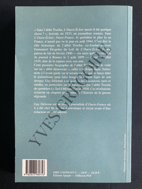 Ce livre a pour objet de tirer de l'oubli un prêtre, homme de presse — l'abbé trochu —, co-fondateur avec Emmanuel Desgrées du Loû, de L'Ouest-Éclair, l'ancêtre d'Ouest-France, le premier quotidien régional et le plus important tirage de la presse française. patron de fait du journal, depuis février 1900 — six mois après sa création le 2 août 1899 — jusqu'en 1930, il le conduisit au succès grâce à ses qualités d'organisateur, d'animateur et de gestionnaire. Cet humaniste, à l'avant-garde dans le domaine social, semeur d'idées nouvelles, bascula avec l'ardeur d'un rebelle les conservatismes d'une société figée. Il fut le promoteur de l'émancipation paysanne, jetant les bases d'un nouveau syndicalisme qui donna une avance aux paysans bretons. Voir le sommaire sur photos jointes.
