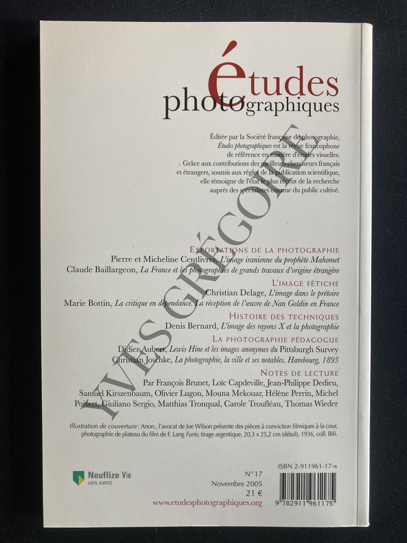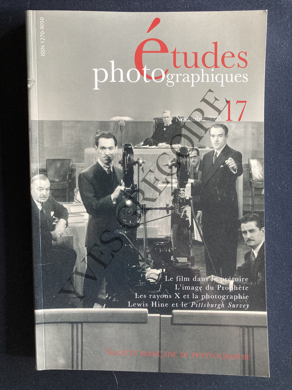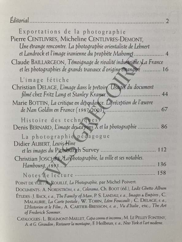 184 PAGES-IN 8-PIERRE CENTLIVRES, MICHELINE CENTLIVRES DEMONT: UNE ETRANGE RENCONTRE LA PHOTOGRAPHIE ORIENTALISTE DE LEHNERT ET LANDROCK ET L'IMAGE IRANIENNE DU PROPHETE MAHOMET, 14 PAGES-CLAUDE BAILLARGEON: TEMOIGNAGES DE RIVALITE INDUSTRIELLE LA FRANCE ET LES PHOTOGRAPHIES DE GRANDS TRAVAUX D'ORIGINE ETRANGERE, 28 PAGES-CHRISTIAN DELAGE: L'IMAGE DANS LE PRETOIRE USAGES DU DOCUMENT FILME CHEZ FRITZ LANG ET STANLEY KRAMER, 23 PAGES-MARIE BOTTIN: LA CRITIQUE EN DEPENDANCE LA RECEPTION DE L'OEUVRE DE NAN GOLDIN EN FRANCE (1987-2003), 19 PAGES-DENIS BERNARD: L'IMAGE DES RAYONS X ET LA PHOTOGRAPHIE, 26 PAGES-DIDIER AUBERT: LEWIS HINE ET LES IMAGES ANONYMES DU PITTSBURGH SURVEY, 24 PAGES-CHRISTIAN JOSCHKE: LA PHOTOGRAPHIE, LA VILLE ET SES NOTABLES HAMBOURG 1893, 22 PAGES-NOTES DE LECTURE-(11D)