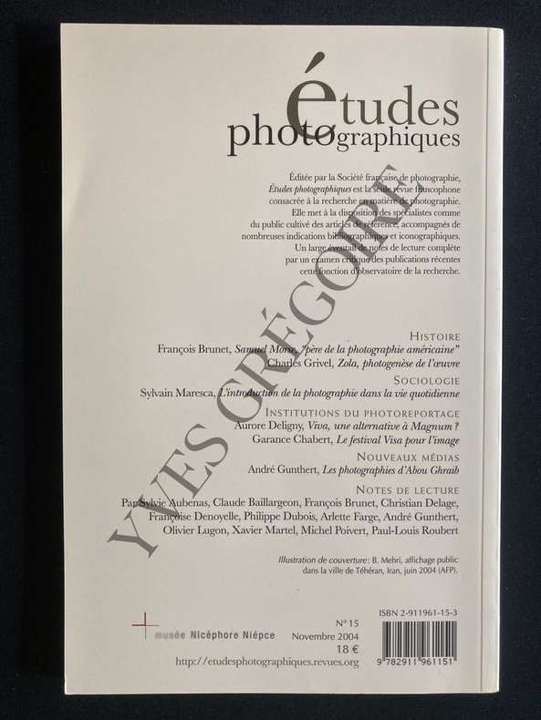 160 PAGES-IN 8-FRANCOIS BRUNET: SAMUEL MORSE "PERE DE LA PHOTOGRAPHIE AMERICAINE", 27 PAGES-CHARLES GRIVEL: ZOLA PHOTOGENESE DE L'OEUVRE, 30 PAGES-SYLVAIN MARESCA: L'INTRODUCTION DE LA PHOTOGRAPHIE DANS LA VIE QUOTIDIENNE ELEMENTS D'HISTOIRE ORALE, 17 PAGES-AURORE DELIGNY: VIVA, UNE ALTERNATIVE A MAGNUM?, 26 PAGES-GARANCE CHABERT: LE FESTIVAL VISA POUR L'IMAGE UNE IDENTITE CULTURELLE AMBIGUE, 20 PAGES-ANDRE GUNTHERT: L'IMAGE NUMERIQUE S'EN VA-T'EN GUERRE LES PHOTOGRAPHIES D'ABOU GHRAIB, 11 PAGES-NOTES DE LECTURE, HARTUNG-(11D)