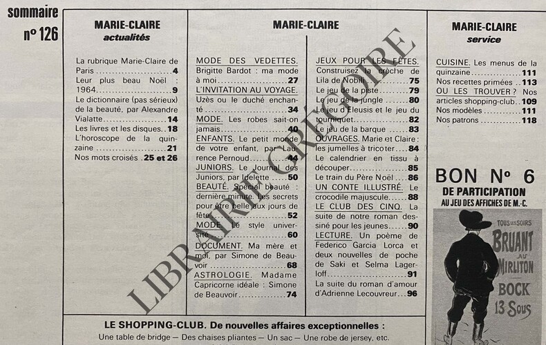 120 PAGES 26 CM X 34 CM-BRIGITTE BARDOT EN COUVERTURE "BB MA MODE A MOI"-BB: MA MODE A MOI, 7P, 23 PHOTOS-UZES LE DUCHE ENCHANTE, 6P-LA ROBE "SAIT-ON JAMAIS.", 4P, 5 PHOTOS-MODE M-C, 7P-LE CAS DE CONSCIENCE DE SIMONE DE BEAUVOIR, PAR CHRISTINE DE RIVOYRE, 8P-LA CRECHE DE MARIE-CLAIRE-UNE NOUVELLE DE POCHE "LA LEGENDE DE LA ROSE DE NOEL", PAR SELMA LAGERLOF-"LES MACHINATIONS DE LA DUCHESSE", PAR PAUL LORENZ, ILLUSTRATIONS DE JEAN-PAUL GOUDE