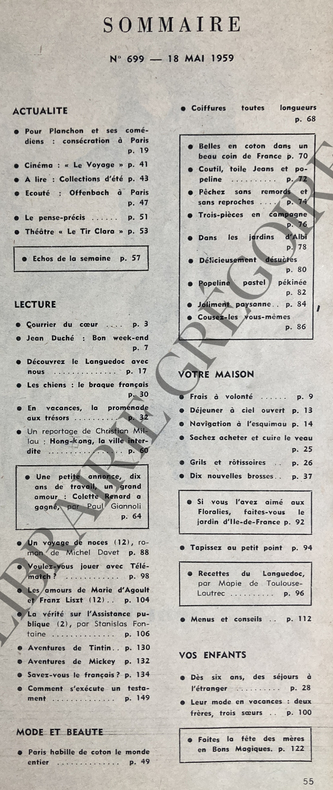 168 PAGES-CRITIQUES PAR PHILIPPE HERIN DES FILMS "LE VOYAGE" D'ANATOLE LITVAK ET "UNE SIMPLE HISTOIRE" DE MARCEL HANOUN-LES BERLINOIS CHANTENT OFFENBACH Ã PARIS, ARTICLE-CRITIQUE PAR JEAN JACQUES GAUTIER DE LA PIECE "LE TIR CLARA" DE JEAN LOUIS RONCORONI MISE EN SCENE PAR JEAN LOUIS BARRAULT-3 PAGES AVEC PHOTOS AUTOUR DE LA PRESENTATION AU FESTIVAL DE CANNES DU FILM "LES 400 COUPS" REALISE PAR FRANCOIS TRUFFAUT, ESSENTIELLEMENT AU SUJET DU JEUNE PREMIER ROLE JEAN PIERRE LEAUD-4 PAGES AVEC PHOTOS AU SUJET DU FILM DOCUMENTAIRE "HONG KONG VU PAR ORSON WELLES" PAR CHRISTIAN MILLAU-"COLETTE RENARD A GAGNE" PAR PAUL GIANNOLI-"BELLES EN COTON DANS UN BEAU COIN DE FRANCE", 16 PAGES AVEC PHOTOS COULEURS-COMPLET
