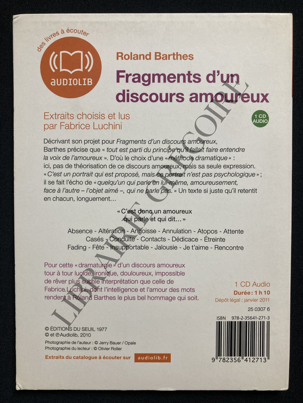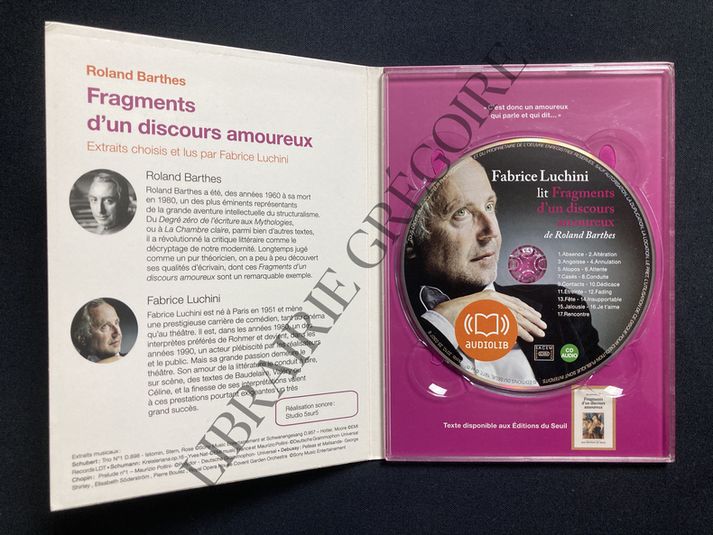 CD-DUREE 1 H 10-EXTRAITS CHOISIS ET LUS PAR FABRICE LUCHINI-1 ABSENCE-2 ALTERATION-3 ANGOISSE-4 ANNULATION-5 ATOPOS-6 ATTENTE-7 CASES-8 CONDUITE-9 CONTACTS-10 DEDICACE-11 ETREINTE-12 FADING-13 FETE-14 INSUPPORTABLE-15 JALOUSIE-16 JE T'AIME-17 RENCONTRE-(16F)