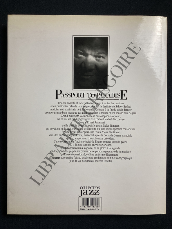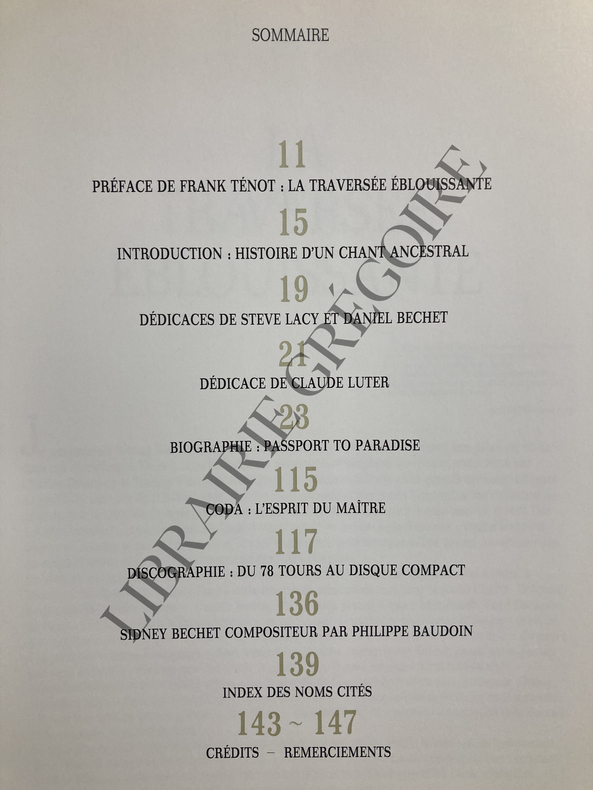 150 PAGES-25 CM X 31 CM-PREFACE DE FRANK TENOT: LA TRAVERSEE EBLOUISSANTE-INTRODUCTION: HISTOIRE D'UN CHANT ANCESTRAL-DEDICACES DE STEVE LACY ET DANIEL BECHET-DEDICACE DE CLAUDE LUTER-BIOGRAPHIE: PASSPORT TO PARADISE-CODA: L'ESPRIT DU MAITRE-DISCOGRAPHIE: DU 78 TOURS AU DISQUE COMPACT-SIDNEY BECHET COMPOSITEUR PAR PHILIPPE BAUDOIN-INDEX DES NOMS CITES-CREDITS-REMERCIEMENTS-RELIURE TOILEE BLANCHE-JAQUETTE-(100C)